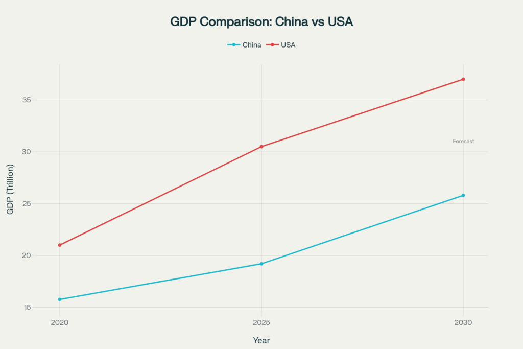กราฟเปรียบเทียบการเติบโตทางเศรษฐกิจระหว่างจีนและสหรัฐฯ ปี 2020-2030 (รวมคาดการณ์)