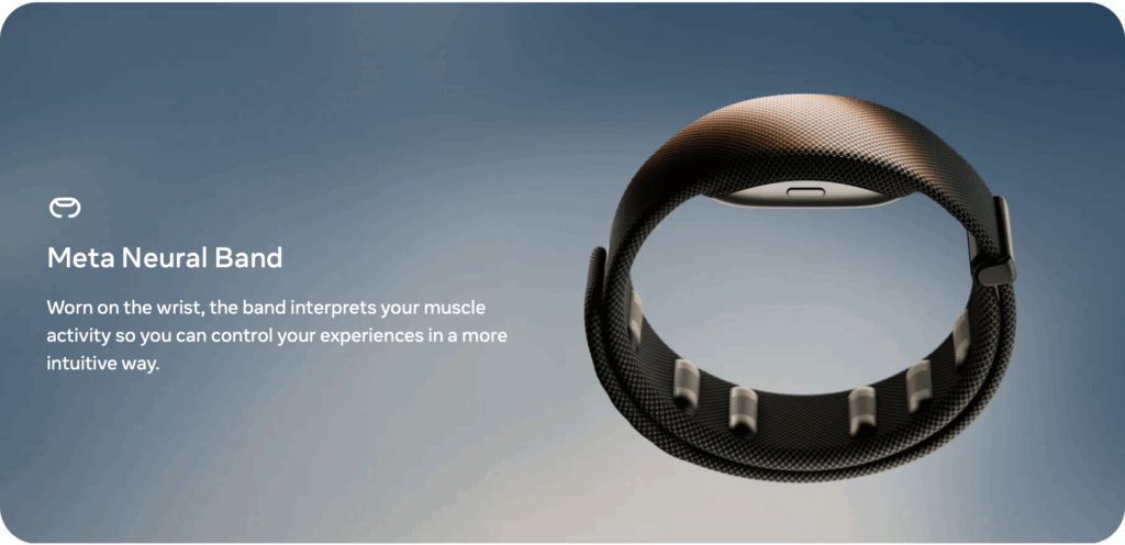 สิ่งที่ทำให้แว่นตาคู่นี้พิเศษคือ Neural Band ซึ่งเป็นสายรัดข้อมือที่ใช้เทคโนโลยี sEMG (surface Electromyography) ในการตรวจจับสัญญาณไฟฟ้าจากกล้ามเนื้อข้อมือ ทำให้สามารถควบคุมแว่นตาด้วยการเคลื่อนไหวของนิ้วมือได้อย่างละเอียด โดยไม่ต้องชูมือขึ้นหรือสัมผัสแว่นตา