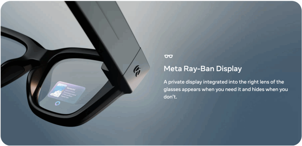 Meta Ray-Ban Display ถือเป็นแว่นตา สมาร์ทกลาสส์ รุ่นแรกของ Ray-Ban ที่มีจอแสดงผลแบบ HUD ขนาดเล็กฝังอยู่ในเลนส์ด้านขวา จอแสดงผลนี้มีความละเอียด 600 x 600 พิกเซล รองรับ อัตราการรีเฟรช 90Hz และความสว่างสูงสุด 5,000 นิต ทำให้สามารถมองเห็นข้อมูลได้ชัดเจนแม้ในแสงแดดจ้า